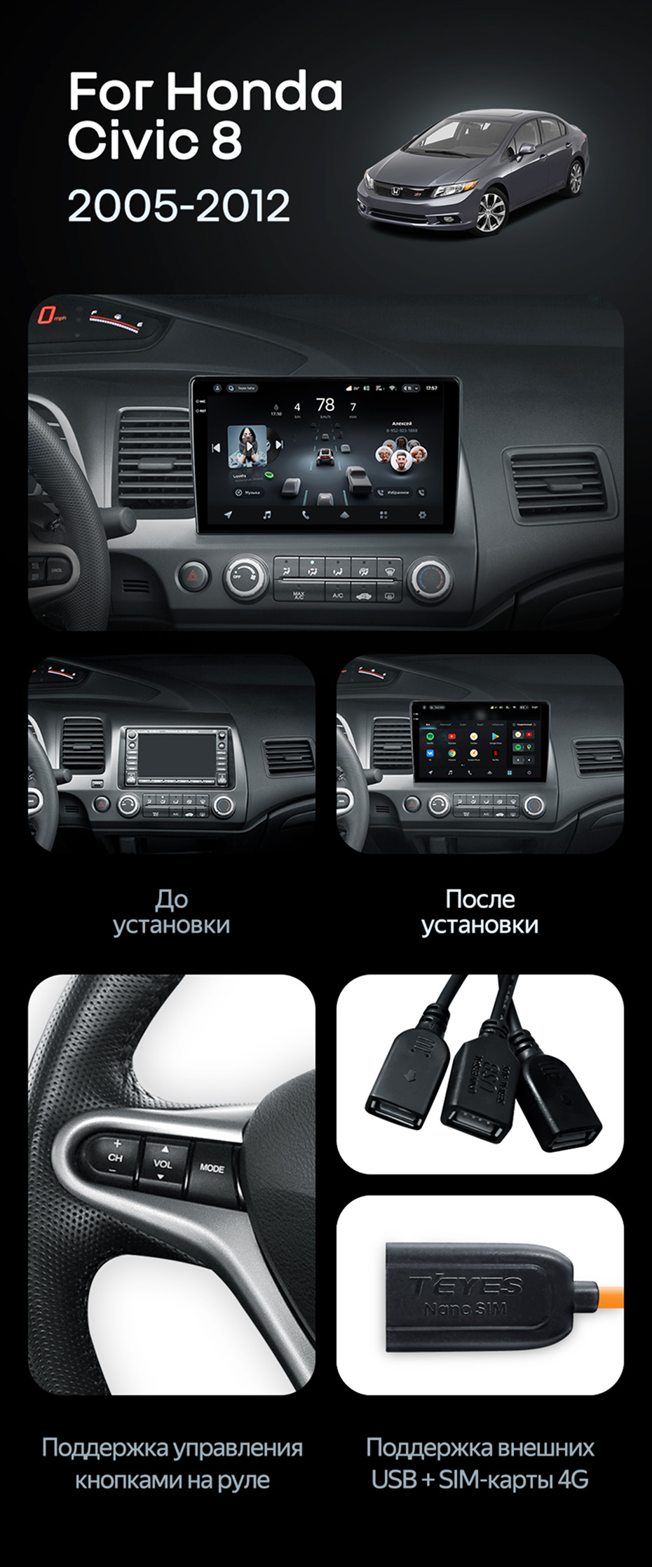 Штатная магнитола Teyes CC4 Pro 12/256 Honda Civic 8 FK FN FD (2005-2012) - купить всего за 73 560 руб. в интернет-магазине в Перми Teyes.com.ru. ✓ Самый лучший выбор мультимедиа ✓ Лучшая замена штатному ГУ ✓ Тел. +7 (800) 775-31-74