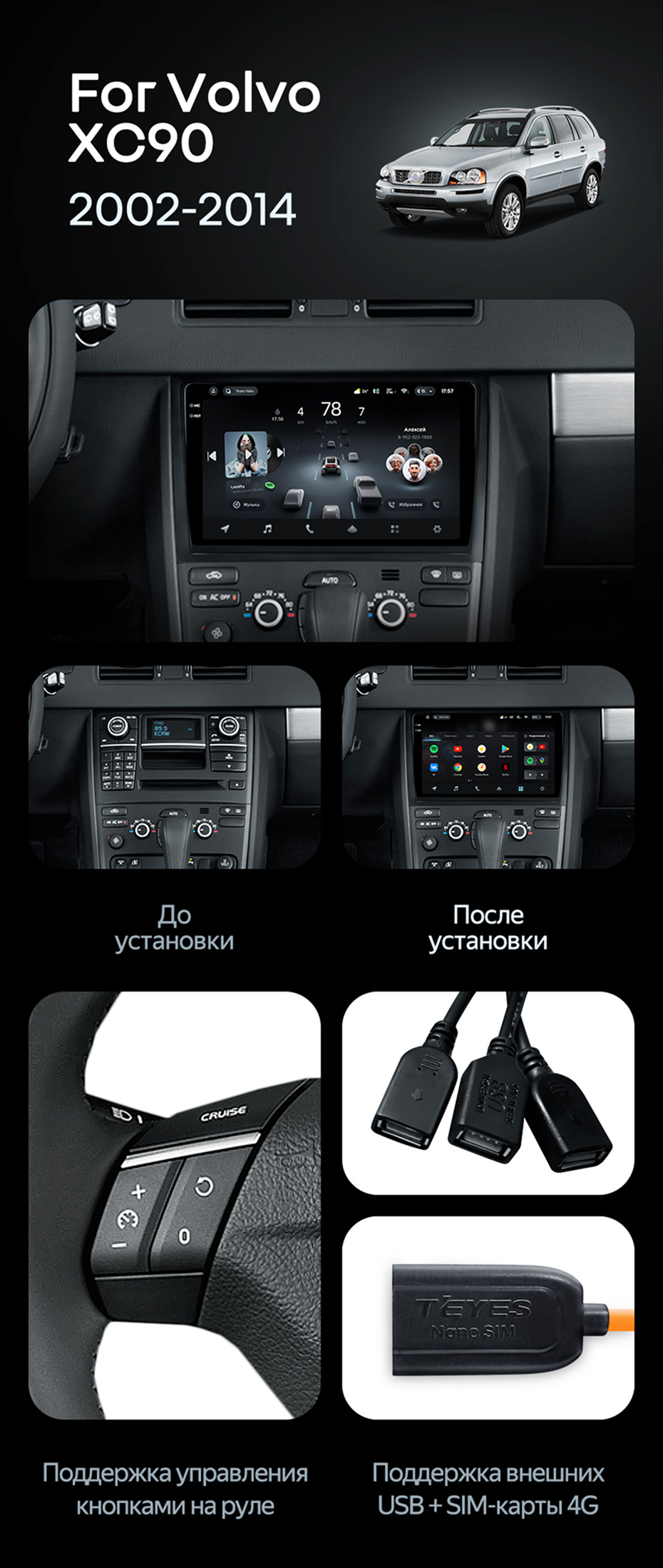 Штатная магнитола Teyes CC4 Pro 8/128 Volvo XC90 (2007-2014) F2 (комплект для установки нижней части) - купить всего за 69 000 руб. в интернет-магазине в Перми Teyes.com.ru. ✓ Самый лучший выбор мультимедиа ✓ Лучшая замена штатному ГУ ✓ Тел. +7 (800) 775-31-74