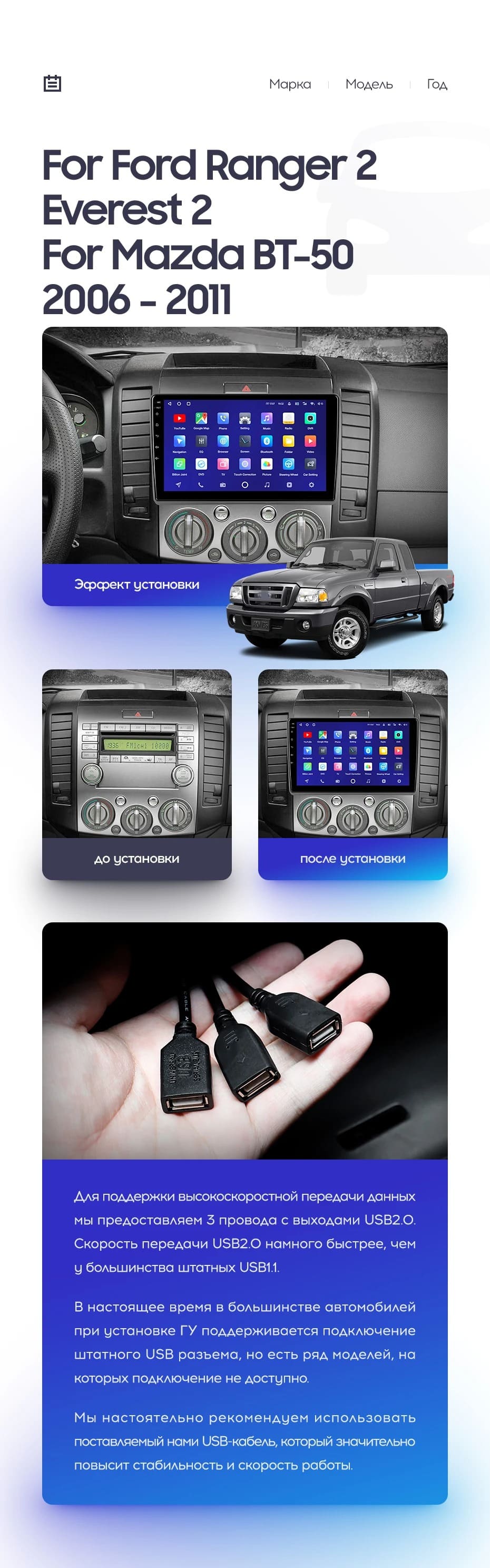Полный комплект установки магнитолы Teyes с рамкой и проводкой можно выбрать в каталоге штатных магнитол Ford Ranger 2 (2006-2011).