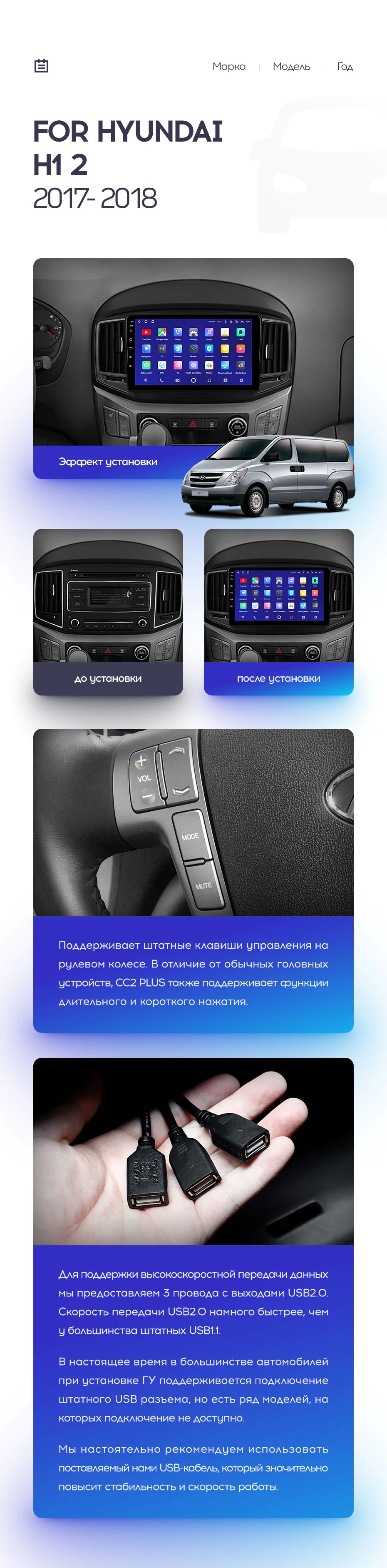 Полный комплект установки магнитолы Teyes с рамкой и проводкой можно выбрать в каталоге штатных магнитол Hyundai H1 2 (2017-2018).