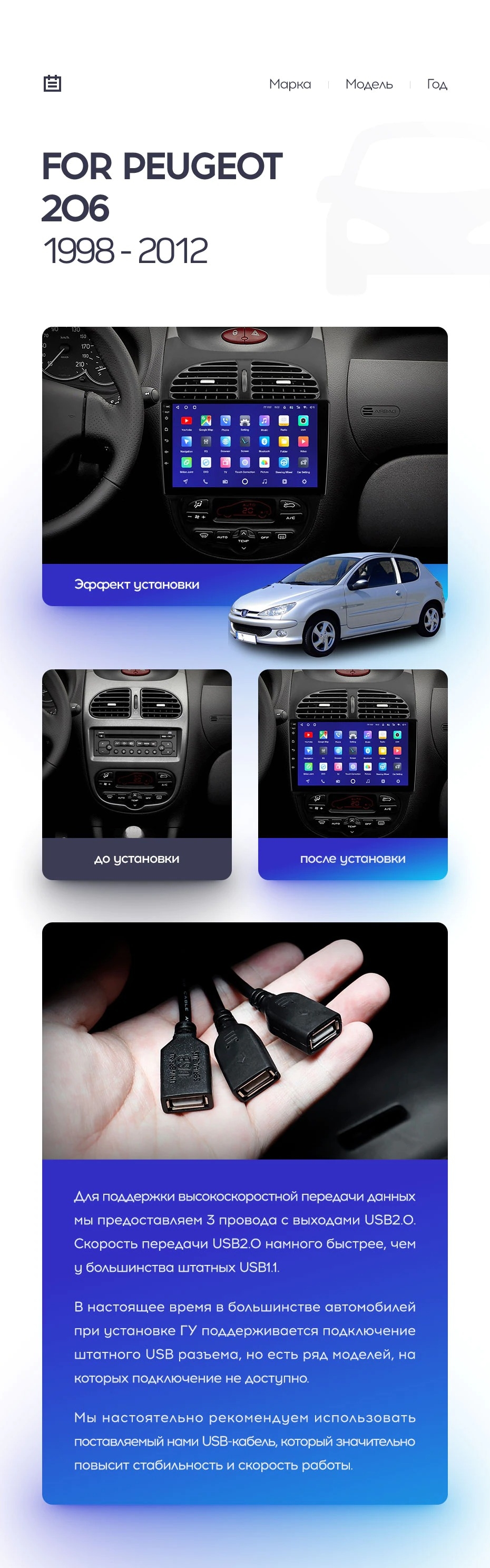 Установочный комплект для Peugeot 206 (1998-2012) включает переходную рамку и проводку.