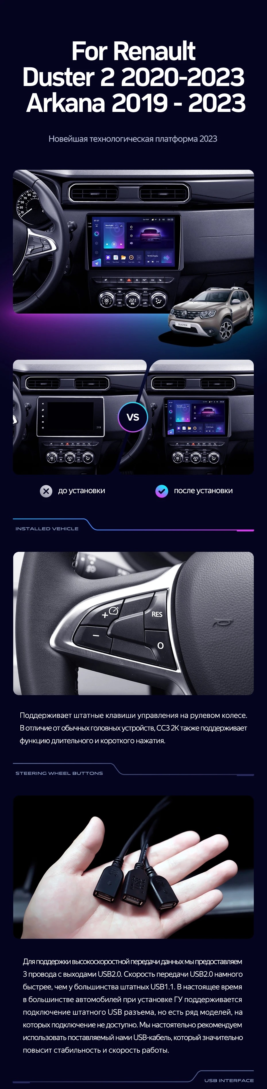 Полный комплект установки магнитолы Teyes с рамкой и проводкой можно выбрать в каталоге штатных магнитол Renault Duster HM 2 (2020-2023).