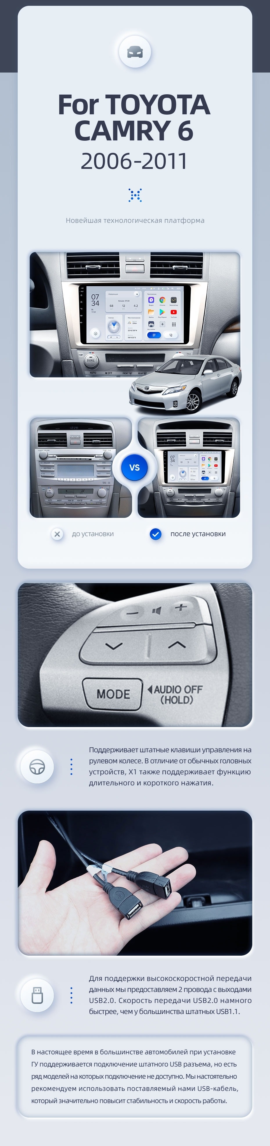 Полный комплект установки магнитолы Teyes с рамкой и проводкой можно выбрать в каталоге штатных магнитол Toyota Camry (2006-2011).
