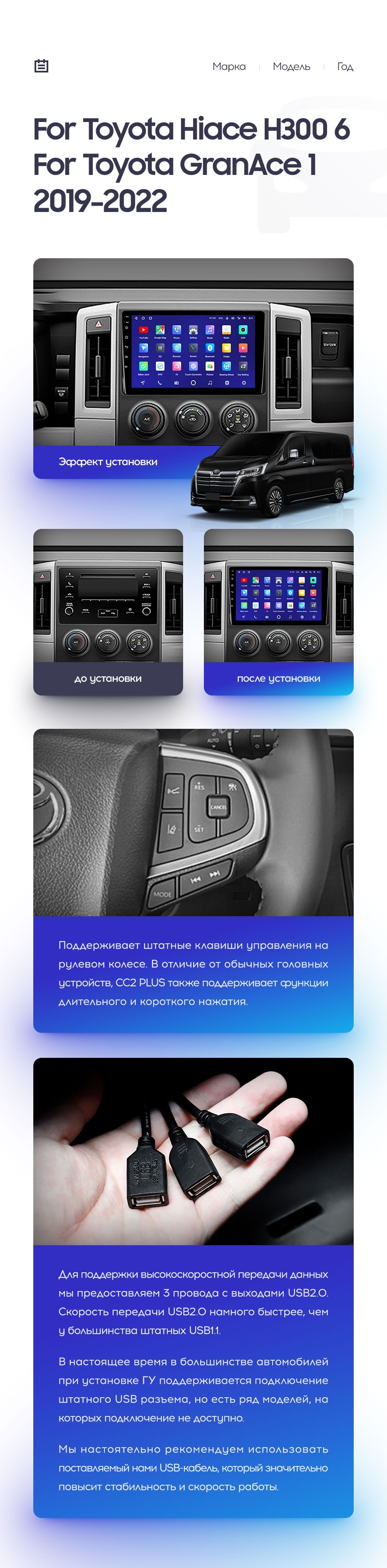 Полный комплект установки магнитолы Teyes с рамкой и проводкой можно выбрать в каталоге штатных магнитол Toyota Hiace H300 VI (2019-2022).