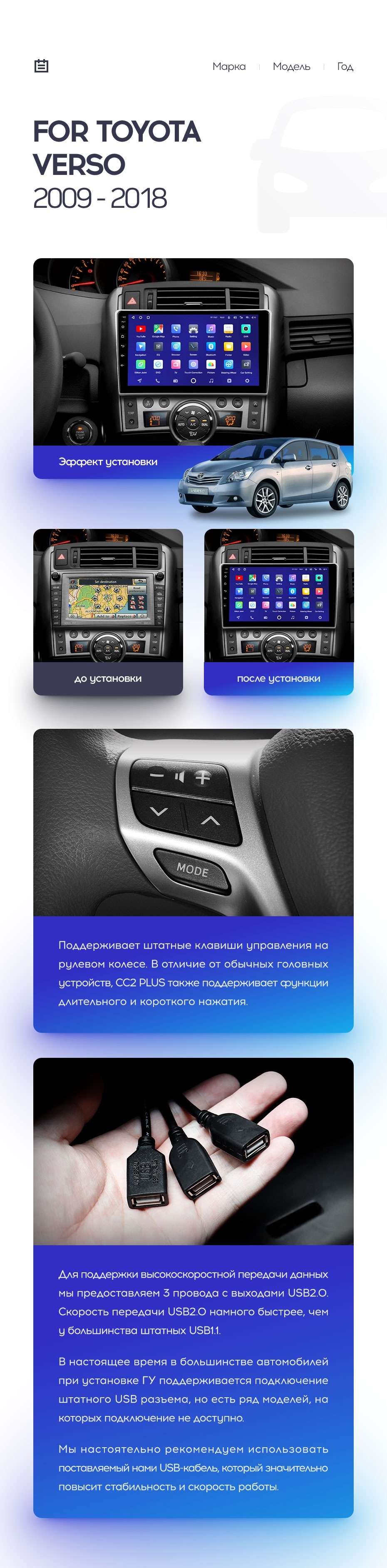 Полный комплект установки магнитолы Teyes с рамкой и проводкой можно выбрать в каталоге штатных магнитол Toyota Verso R20 (2009-2018).