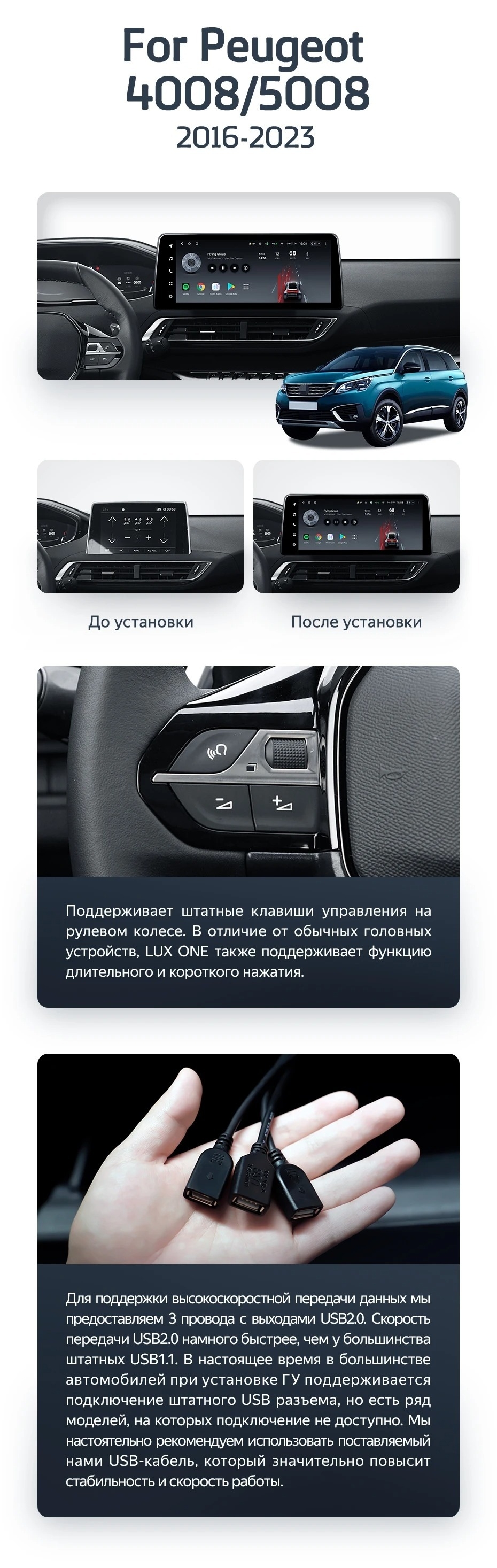 Полный комплект установки магнитолы Teyes с рамкой и проводкой можно выбрать в каталоге штатных магнитол Peugeot 4008 (2016-2023).